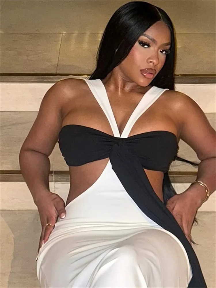 Nibber Off Shoulder Contrast Patchwork Maxi Dress Women Irregular Sleeveless Long Ribbon Midnight Banquet Party Long Bodycon